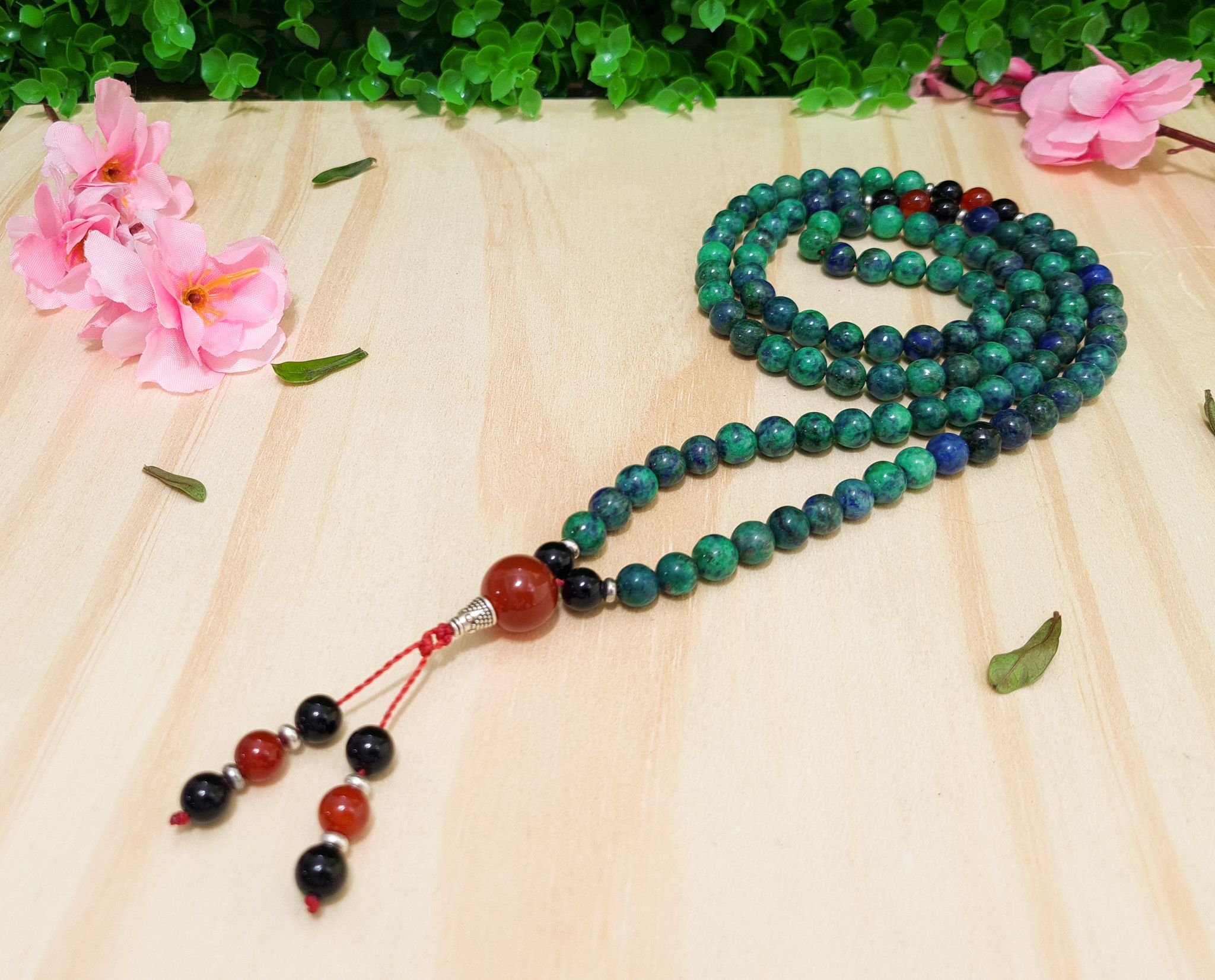 Japamala de Pedra Azurita com Agata Vermelha e Ônix com 108 contas