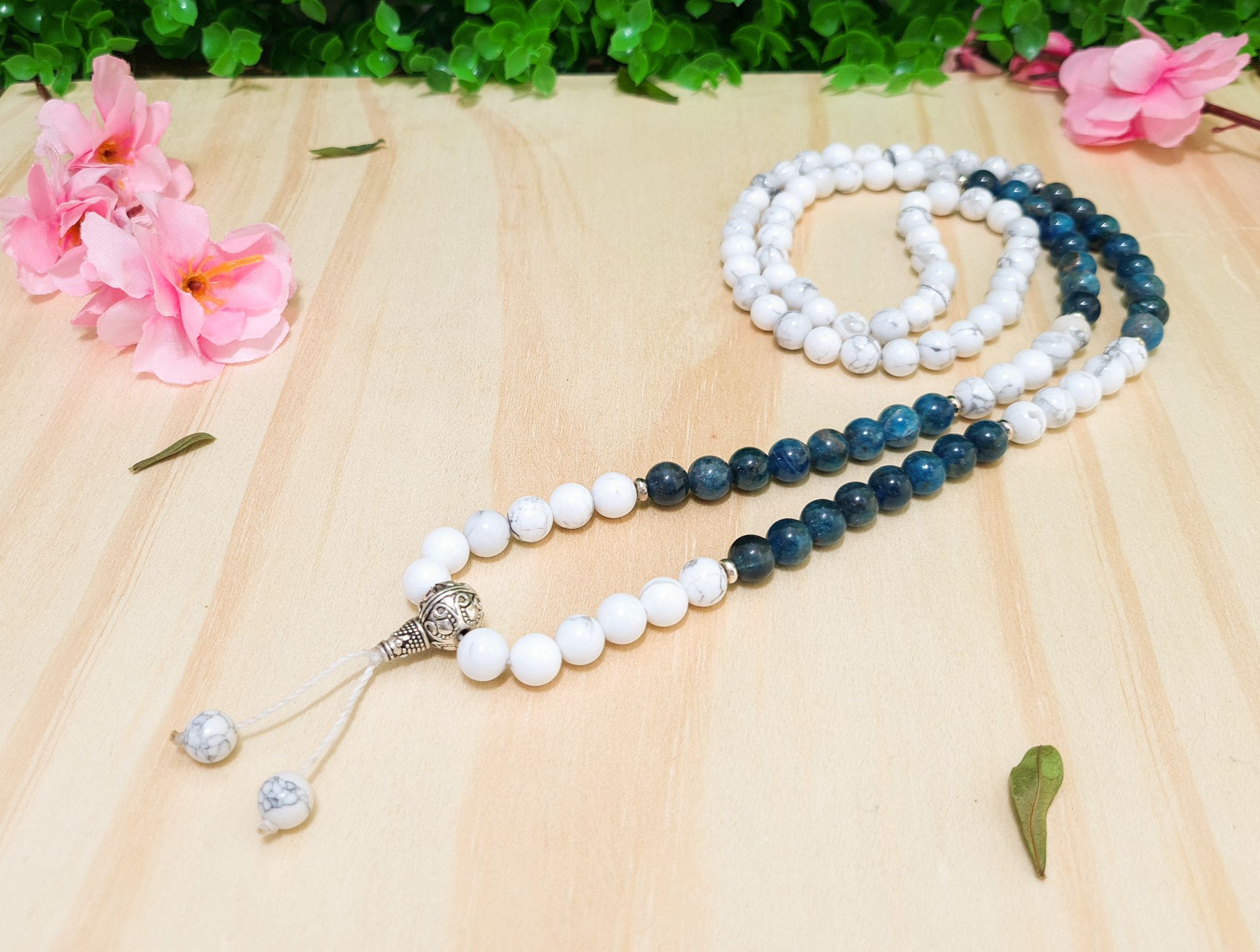 Japamala de Pedra Howlita e Apatita com 108 Contas